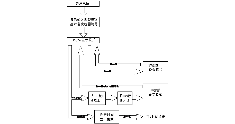 4、 依次按“SET”,PID參數(shù)設定模式將會依次出現(xiàn):Pv,Iv,Dv,ITv,ALv,Tv,Btv,PKv,Ukv。