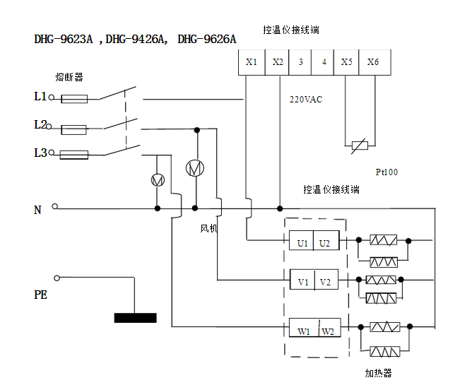 6、DHG-9623A,DHG-9426A,DHG-9626A型號的設(shè)備工作電源為三相五線制,電源插頭接A,B,C三相380V電壓及N零線,保護(hù)接地線接入設(shè)備外殼上專用接柱。
