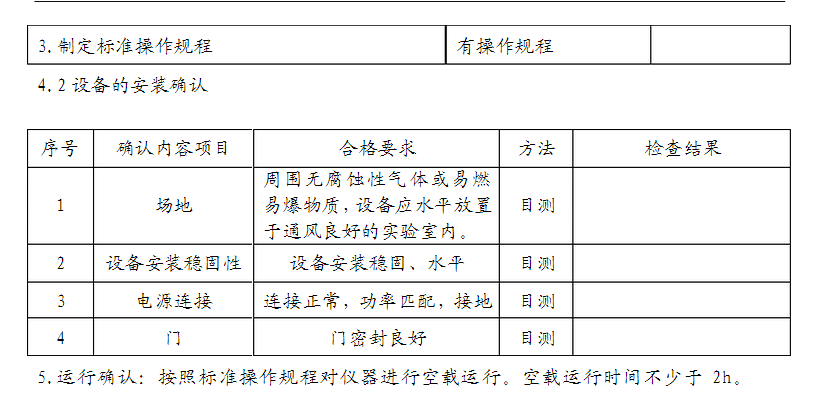 2.驗證目的:通過對設(shè)備資料檢查,運行、性能的確認,確保儀器的相關(guān)資料的齊全、完整,各項性能穩(wěn)定,從而保證檢驗的準確、可靠。 3.驗證依據(jù):???? 4.設(shè)備的預確認 4.1操作規(guī)程等資料確認
